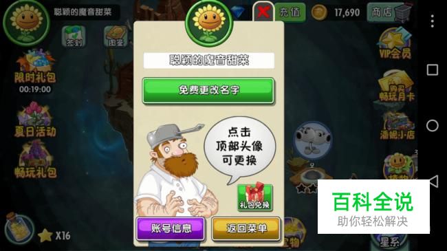 点击“向日葵”图标,就会出现如下页面,在该页面下可以更改自己的名字/头像,礼包兑换,也可以查看账号信息,或者返回菜单。如图所示。