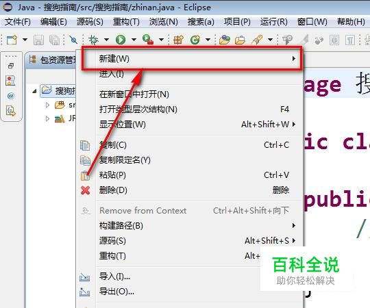 然后在java项目上面单击鼠标右键,选择“新建”菜单。