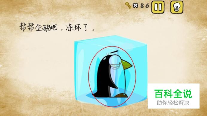 第八关,让我们帮帮可怜的企鹅,企鹅被冻在了冰块里,我们用手按住企鹅,等待冰块融化就好了。
