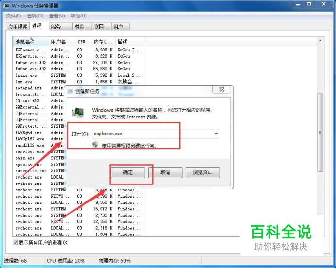 创建新任务 会弹出【创建新任务】窗口,在输入框中,输入【explorer.exe】,然后点击【确定】按钮,如下图所示: