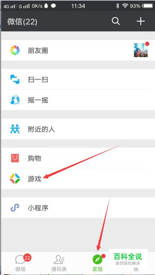 现在只有微信登录的用户才能准确的查看王者荣耀战报。打开微信,点击微信右下角的发现。在出现的页面点击游戏