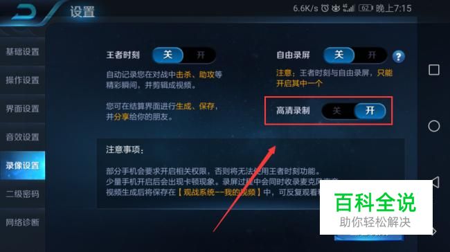 我们选择高清录像之后,我们将那个开关由关着的状态,点击下变为开着的状态就可以了,如图所示。这样我们就完成了王者荣耀设置屏幕录制啦。