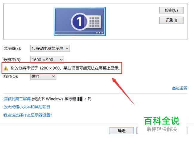 点击保留设置,可以看到里面出现了黄色的警告,说明分辨率设置的低了,屏幕无法显示出来,如图所示: