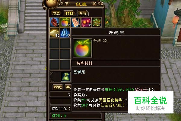 如果玩家想要通过许愿果兑换强化精华或者3级红宝石,点击NPC梁道士,然后再点击“许愿果兑换奖励”按键。