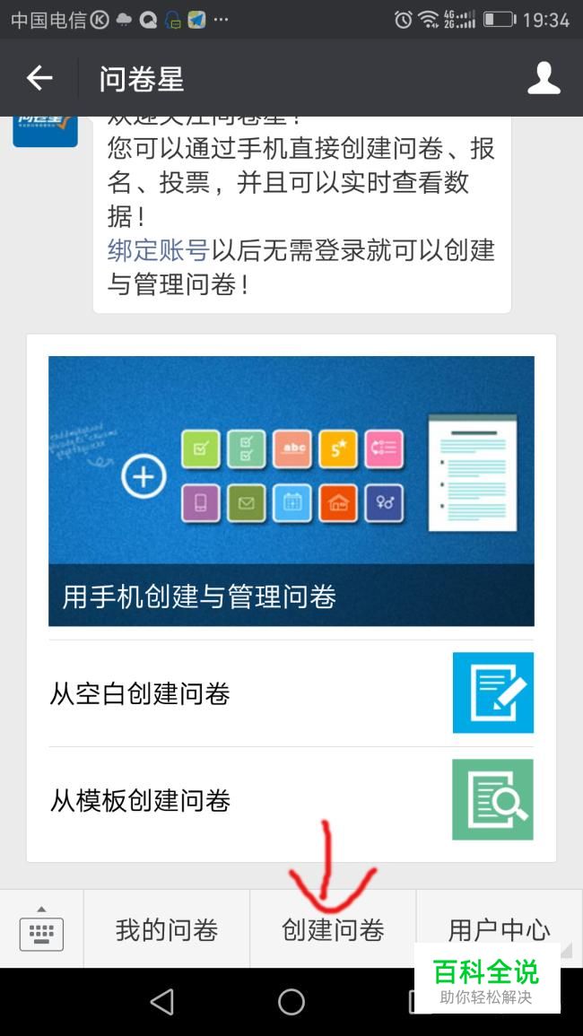 搜索问卷星,然后会有一个公众号,关注他的公众号。进入公众号界面,点击下面的创建问卷,这时候会出现登陆界面,你可以先注册,然后再登录。
