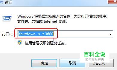 如果我们想让计算机在1小时候关机,则在运行中输入: shutdown -s -t 3600 (3600表示的是3600秒)