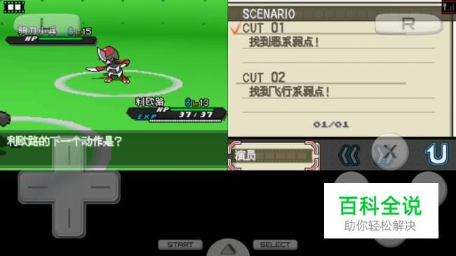 第一个精灵是驹刀小兵,恶系精灵,我们租借的精灵路卡利欧是会格斗系技能发劲的,格斗系克恶系,正好秒掉。