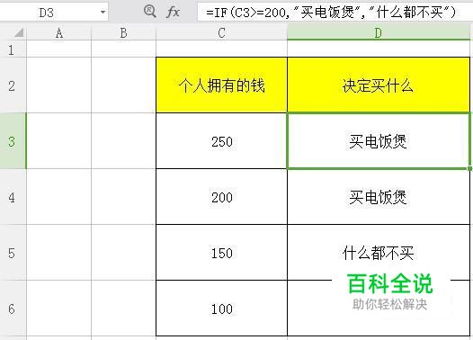 IF函数 根据指定的条件来判断其“真”(TRUE)、“假”(FALSE),根据逻辑计算的真假值,从而返回相应的内容。可以使用函数 IF 对数值和公式进行条件检测。 案例:假如我有大于或等于200元的人民币,我就去买电饭煲,否者就什么都不买。 操作在B2输入,=IF(B2>=200,"买电饭煲","什么都不买"),因为B2单元格是200,符合个人拥有金钱>=200,所以返回第一参数,买电饭煲。具体请参照下图。