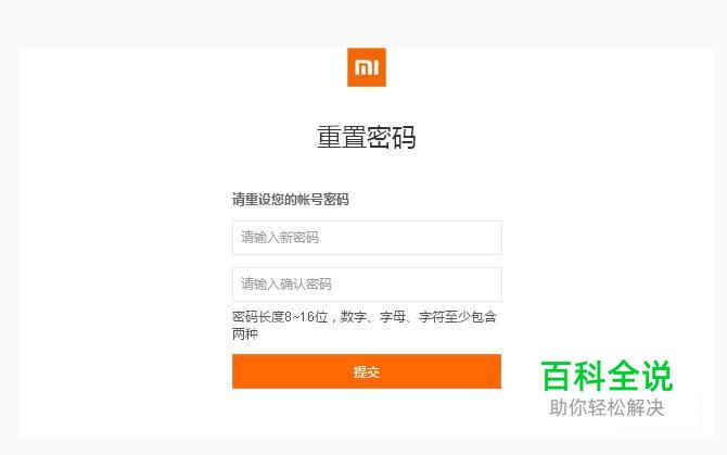 重置密码 按照提示要求输入两次新的密码。密码长度8~16位,数字、字母、字符至少包含两种。