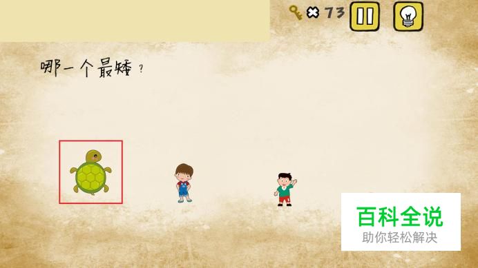 第一关,让我们找一个最矮的生物,当然是乌龟最矮啦,所以我们点击乌龟就可以过关了。