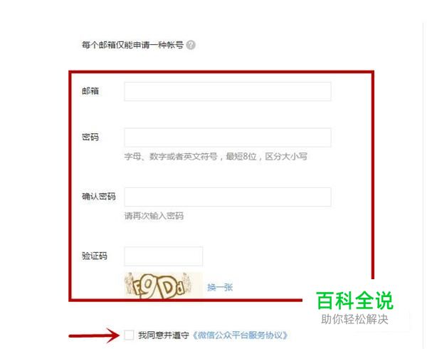 之后我们进入的界面,需要进行邮箱的认证,我们输入邮箱号、密码、确认密码、验证码,并同意协议,如图所示。