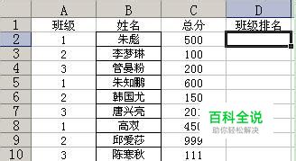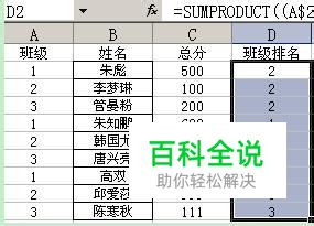 看上图吧,列分别为班级、姓名、总分和班级排名。 首先,这种表格是年级上所安排的考试名单,不能排序,以防止相邻的座位不能有同班的同学。 现在,总分出来了,我们得按照班级的号码,求出各表的每个同学在本班的成绩排名,比如,1班的同学要和1班的进行比较后排名,不能和2、3班一起排名,即每个班级的只能和本班级的进行排名,不能和其它班级混着排名。 那么,如何才能保证各班的和各班的在排名的时候即要准确,同时还要使其它班的排名也一起排出来互不影响。 方法很简单,使用SUMPRODUCT函数就足够了。 一、先看结果 我们先看结果吧,选中D2单元格,然后输入如下图的公式: