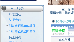 在网站的上方找到“证书查询”进入证书验证的页面,我们可以通过电话的IEMI码查询,点击下面的“移动电话IEMI验证”