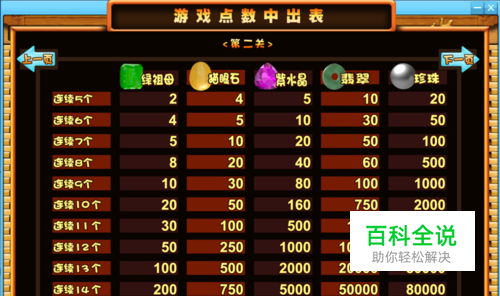 第一关是4×4的方型区域。由中出表可知:第一关有连续4个图案连在一起的时候开始计分。如图显示4个相连的白玉(由第一关游戏点数中出表知中奖倍数为2),投注:单注20点共投3注,按公式计算就能获得((20/10)×2×3)=12点。