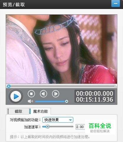 让视频加速以及截取视频片段 导入视频后,我们会进入“预览/截取”对话框,在该对话框点击“魔术功能”选项卡,在该选项卡“对视频施加的功能”处,选择“快进效果”,在“加速速率”处调节即可,数值越大则加速越快。同时,在“预览/截取”对话框,我们还可以截取视频片段,对视频施加慢动作效果、定格效果。