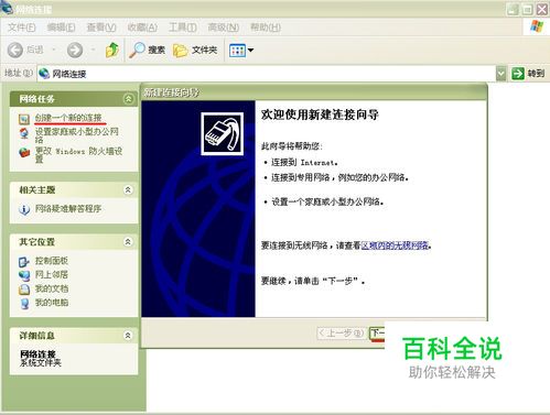 打开计算机“网络连接”,选择‘’创建一个新的连接“,在弹出的窗口中选择下一步。