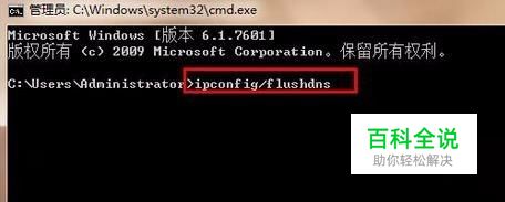 打开管理员命令dos界面后,在光标闪动处输入“ipconfig/flushdns”,回车执行即可,如图所示: