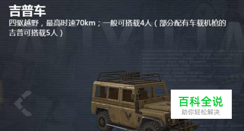 第一种车型是吉普车,最高时速70公里,限载五人,最后一排位置的玩家不能进行探头射击,车辆的耐久度最高,防御力较强,爬坡速度慢。