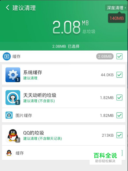 怀疑清理得不够干净?那选择猎豹清理大师界面的深度清理吧!该功扫描更详细,能可以扫描到手机内存与SD卡上的所有文件(如:相册预览图、空文件夹、广告文件、游戏等)扫描完成后勾选出你要删除的文件点击清理即可。如下图所示