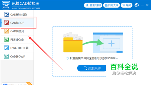 点击完成后就可以添加文件了,这里有两种方法进行添加,可以拖拽添加,也可以直接点击“添加文件”,点击“添加文件”后我们就可以在新出现的窗口中选择cad文件进行添加了。