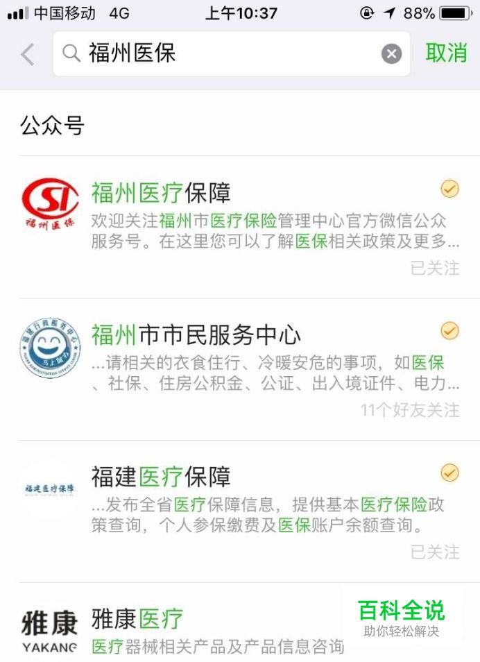 点击添加朋友选项后,点击最下方找到公众号选项,然后在输入栏输入福州医保进行搜索。