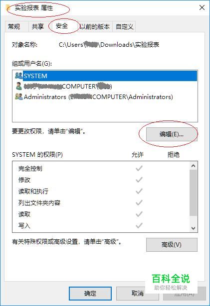 弹出文件夹"属性"对话框,如图所示。选择"安全"标签,点击"组或用户名→编辑"按钮。