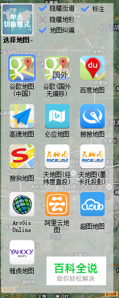 2. 切换地图模式,支持的地图模式包含卫星地图(含街道),卫星地图(不含街道)、电子地图(含街道)、电子地图(不含街道)、地形地图(含街道)、地形地图(不含街道)。
