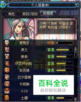 DNF在第七章开放的NPC好感度是一个很重要的系统,提高与NPC们的好感度,能从他们哪里得到各种的特殊材料!所以一定要与了解DNF中各位NPC们所喜欢和讨厌的东西,以便自己能更快速的了解到你所要的材料能在那位NPC哪里获得!