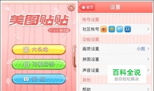 “美图贴贴”功能主要分为制作大头贴和可爱拼图。首次使用可以点击软件首页右上角齿轮设置按钮进行相关设置。