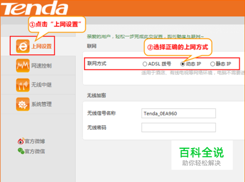 解决方法:进到路由器设置页面,点击“上网设置”选择正确的上网方式。