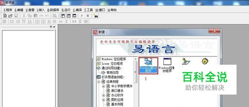 首先,运行“E.exe”主程序,在弹出的“新建工程”文件对话框中选择“Windows窗口程序”并点击“确定”按钮,进入“Windows窗口程序”设计界面。