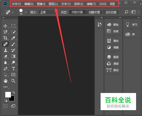 首先,打开PS CC2018,先认识下界面,顶部“文件、编辑、图像……”这里是菜单栏,每条菜单栏有特定的功能。