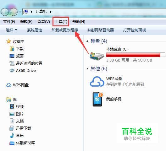 在桌面上找到计算机图标,双击这个图标在弹出的对话框内找到工具选项,如图所示:
