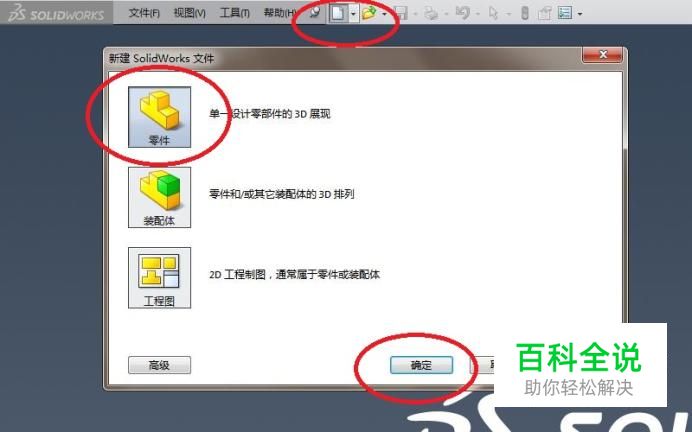 如下图所示, 打开SolidWorks软件, 点击标题栏中的“新建”图标, 在随后弹出的“新建SolidWorks文件”对话框中选择“零件”, 最后点击对话框下方的“确定”, 至此, 完成一个空白零件文件的创建。