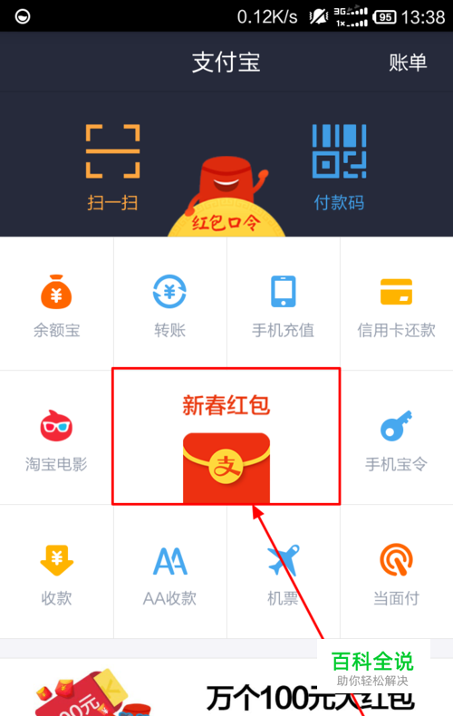 打开手机支付宝,登录之后,进入主页,选择新春红包。