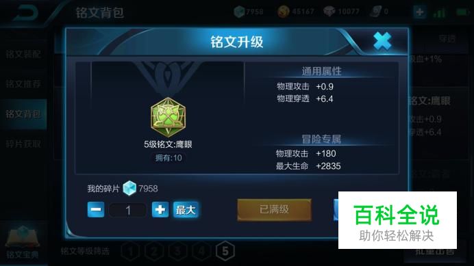 然后绿色的铭文,我们一般搭配的是鹰眼,增加她的物理攻击和物理穿透。