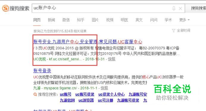 通过搜索工具检索“uc账户中心”,点按合适的搜索结果点击进入。
