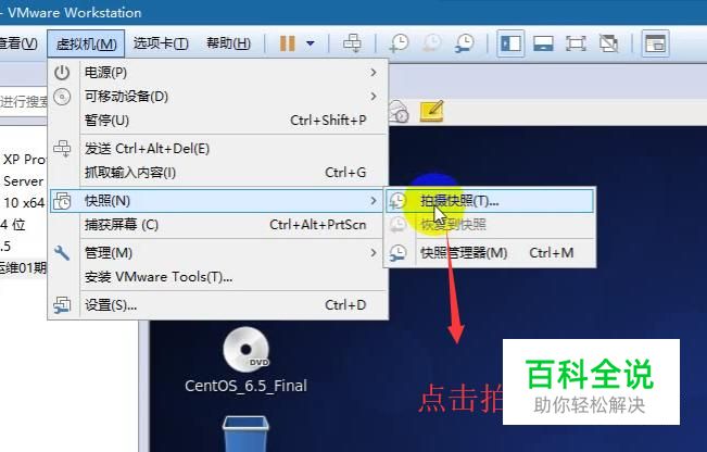 点击顶部的虚拟机菜单,选择快照下面的拍摄快照选项,如下图所示