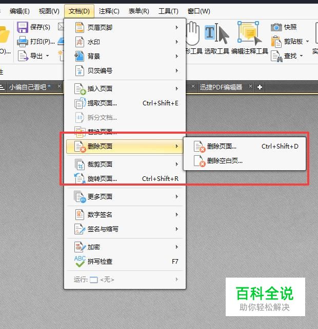 在打开编辑软件后,选择菜单栏中的文档选项,点击文档后,选择文档中的删除页面,在删除页面工具中有删除页面以及删除空白页两项。