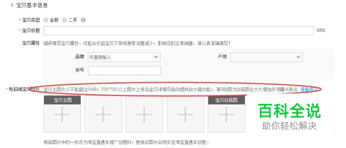 在这里上传淘宝产品的主图,在图片上面会有文字提醒说,图片的内存大小不能超过3MB,现在淘宝主图默认的像素是800*800,所以这里才会说 700*700 以上图片上传后宝贝详情页自动提供放大镜功能。所以这里我们要注意一下。