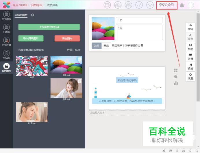在秀米编辑器中编辑好图文后,点击页面右上角的“授权公众号”。注:如已授权忽略此步骤。