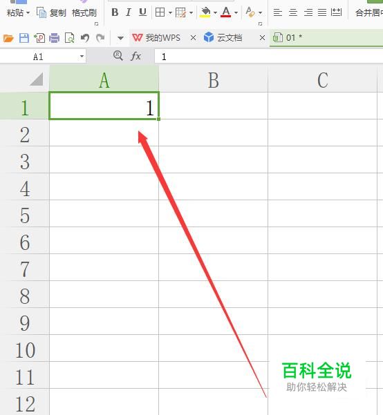 进入之后,在A1单元格上面输入一个“1”,如图所示。