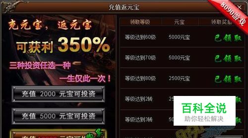 在8090怒火传奇中,如果你是打算长期玩的,那么可以在新区充值一笔小额投资,在返还元宝中,只要充值超过2000元宝的玩家就可以参加投资活动了,投资的元宝会在您升级到对应的等级的时候返还给你,总共可以获利350%,而且只能参加一次,看过绝对就不能错过了。