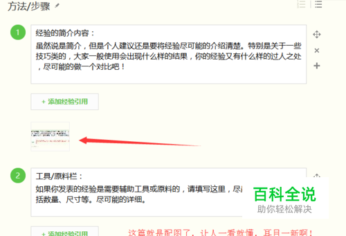 工具/原料栏: 如果你发表的经验是需要辅助工具或原料的,请填写这里,尽量的填写清楚。包括数量、尺寸等。尽可能的详细。