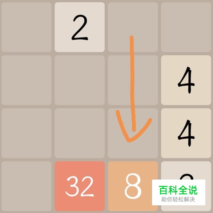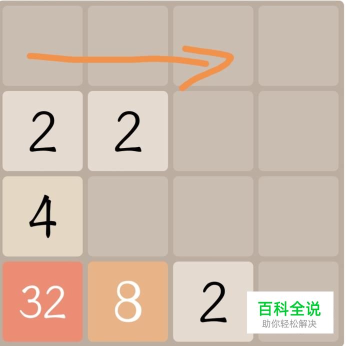 游戏刚开始的时候可以看到都是一些比较小的数字,往箭头方向滑动屏幕,将两个最小的数字“2”合成为较大的数字“4”