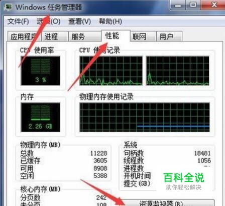 然后点击性能中的资源监控器,如下图所示。