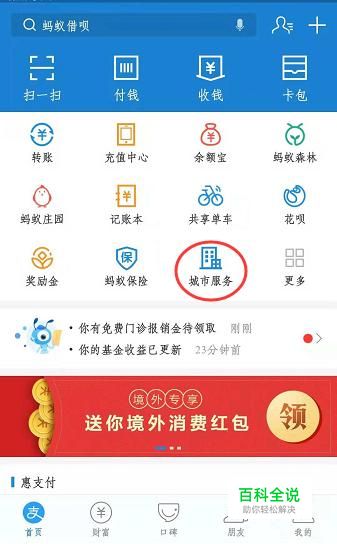 首先打开支付宝的首页,找到“城市服务”这个选项。
