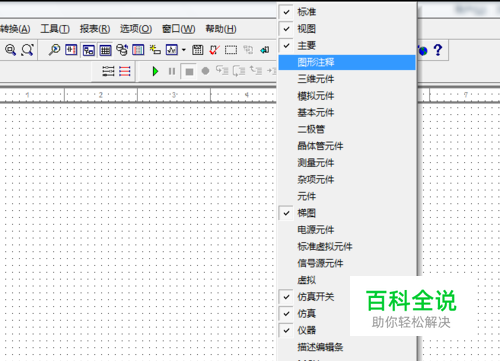 放置器件时使用元件工具栏会很快,从左到右依次是信号源、基础元件、二极管、晶体管、模拟元件等等,所有的元件都在这里了;