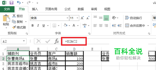 3.如图所示,在查询销售额时,有两个条件,业务员和客户都要确定。 这时可以把业务员和客户所在列并成一列在进行查询。 输入公式=B2&C2,&为连接符。