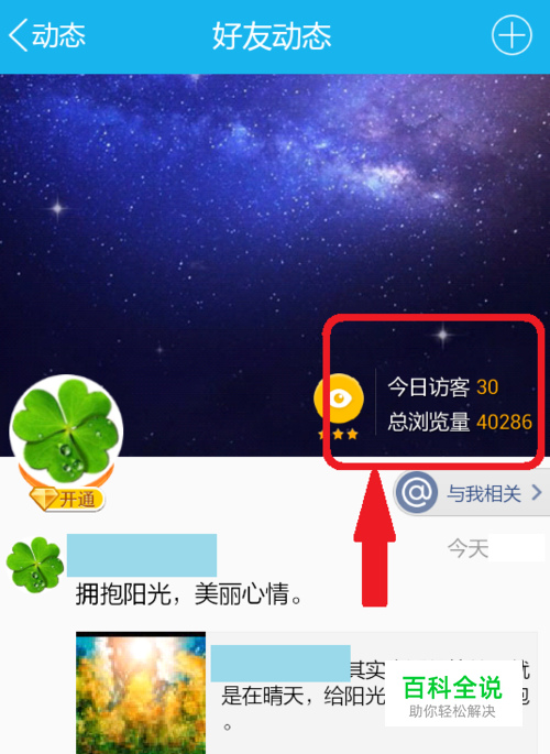 第四,在“好友动态”的背景设置处的右下角可见“今日访客”、“总浏览量”。在电脑QQ的界面是可以直接查看具体的今日访客有哪些,但是在手机QQ的好友动态主页只能看到访客数,那么到底有哪些好友访问了我的空间呢?找到下面图片中标注的红色框,选择该区域,进入“我的访客”。